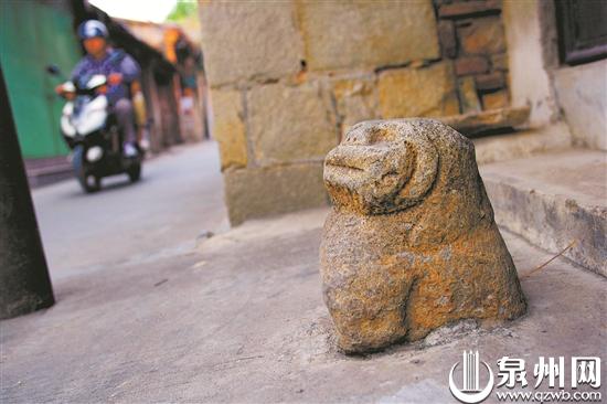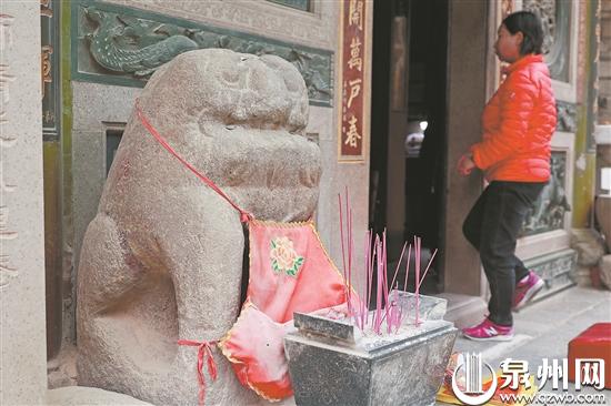 石狮子崇拜,在泉州十分普遍,街头巷尾、庙口村头随处可见大大小小的石狮子造像,现代建筑也喜欢沿用石狮雕塑作为装饰。泉州文史前辈陈泗东先生在其著作《幸园笔耕录》中将泉州的石狮子分为两类:第一类为“守门狮”,必定是一对两只,一雌一雄,其中一狮头左顾,另一狮则右盼;另一类为“风狮”,只有一只,张口,头部向前直看,并不左右顾,且刻有雄性生殖器。譬如泉州提督衙前,即威远楼前的狮子,就起镇压作用,镇全城之风水,保全城之平安。