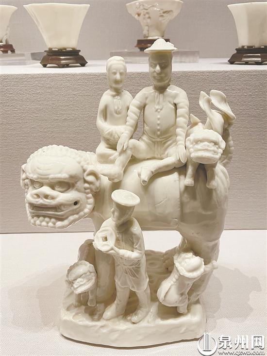 清康熙年间德化窑白釉雕像,为三名欧洲人、一只大狮和三只幼狮。1702年,东印度商船达什伍德号从厦门抵达英国,船上的货品记录可与此类器物相对应,名为“人骑狮”。