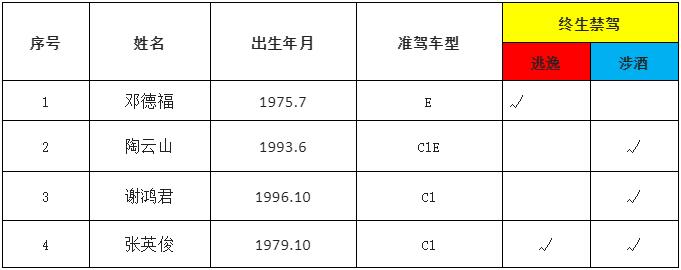 近日,泉州市公安局交警支队向社会公布2022年4月被吊销机动车驾驶证且终生禁驾的4名驾驶人名单。其中2名驾驶人因涉酒驾驶机动车发生交通事故,构成犯罪被终生禁驾;1名驾驶员因交通肇事后逃逸,构成犯罪被终生禁驾;1名驾驶员因涉酒驾驶且在交通肇事后逃逸,构成犯罪被终生禁驾。