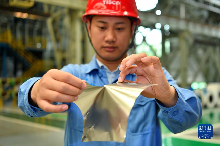 在位于山西的太钢集团,员工在展示用手撕开0.02毫米厚的超薄带状不锈钢(2019年5月24日摄)。新华社记者 曹阳 摄
