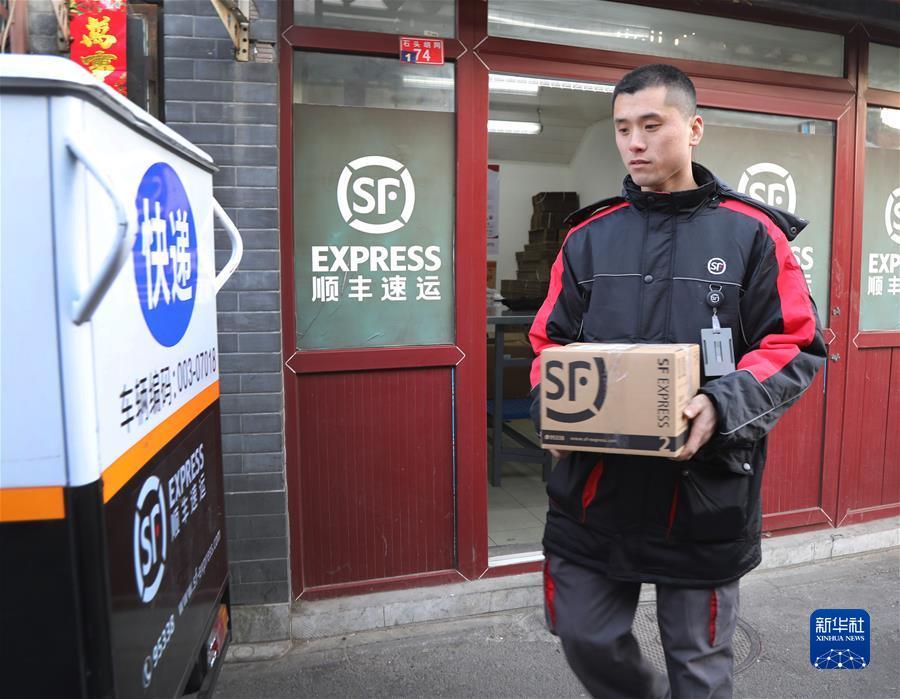 北京前门石头胡同快递站点“快递小哥”刘阔在整理包裹(2019年2月1日摄)。新华社记者 李德欣 摄