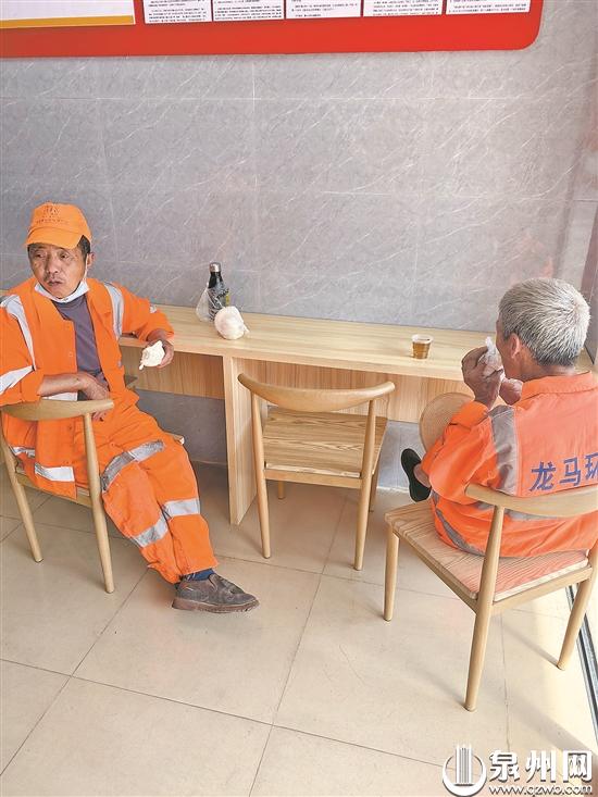 环卫工在馒头店休息吃馒头