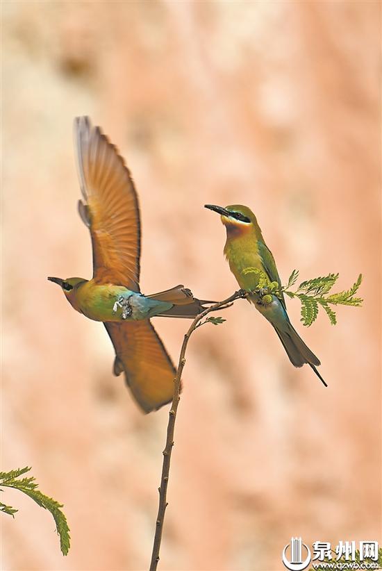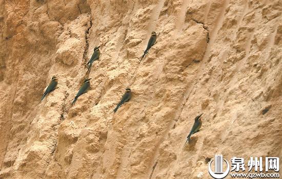 经过泉州观鸟爱好者约半个月的跟踪观测发现,它们已在峡谷旅游路一带筑巢。据悉,这是栗喉蜂虎近3年来在泉州出现数量最多的一次,而泉州也是栗喉蜂虎目前已知全球纬度最北的繁殖地。昨日,记者前往现场一探究竟。