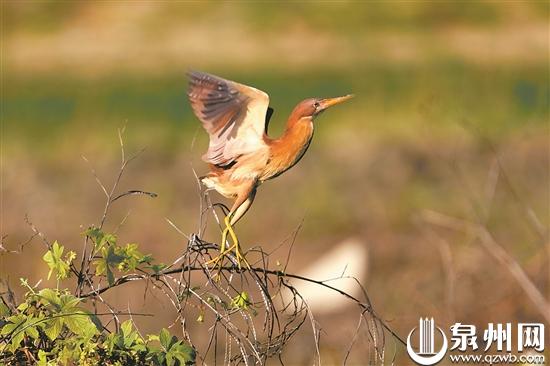 “当时我走在农田里,发现田埂的小灌木上停留着一只羽毛为栗色的水鸟。我小心翼翼地走近观察,但还是惊动了这只水鸟。它瞬间飞起,我按下快门狂拍,才获得这几张照片。”郑榕凯说道,这是栗苇鳽首次在泉州被记录到,希望大家能够好好保护这片田园,也希望其他鸟友在前往拍摄观测鸟类的时候遵守鸟类保护准则,不打扰它们的生活,让更多珍稀鸟类能在泉州停留更长时间。