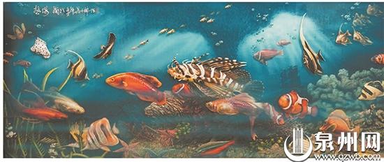 阳光照射下,颜色各异的鱼儿在海里漫游,一串串气泡从鱼儿的嘴里吐出、上升。这幅3D立体画作《热海藏珍》的原料不是普通的画布与画纸,它就是通草。