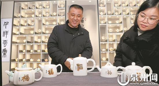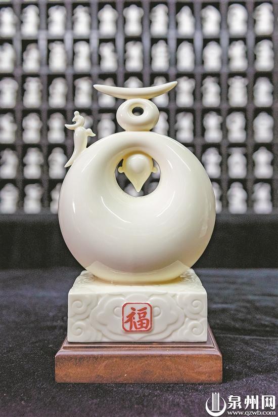 白瓷茶壶与书法“福”结合,创作“百福”壶;以“蝠”寓福,创作瓷盘、瓷塑;对汉字“福”进行艺术处理,创作立体汉字瓷塑……德化陶瓷与福文化深度融合并不断传承、创新,充满无限潜力——“福”见德化瓷