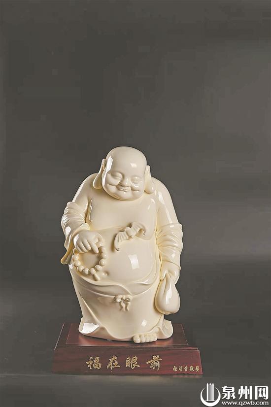 至现代,蝙蝠仍被广泛运用于陶瓷中,寓意吉祥及追求幸福之意。在德化陶知然陶瓷文化创意有限公司,一尊名字为《福在眼前》的陶瓷作品立于展柜之上。一尊弥勒佛袒胸露背、笑容可掬,目视胸前的蝙蝠。“佛教里弥勒佛又称未来佛,蝠与福谐音,寓意对未来幸福生活的美好期盼。”该公司负责人、福建省工艺美术大师张明贵说。