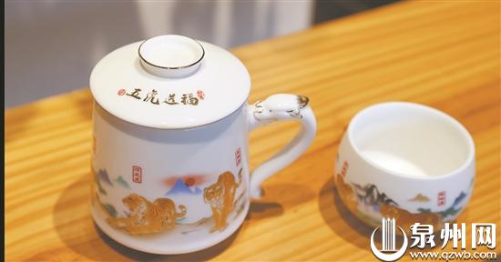 此外,郑建忠还与德化正雅陶瓷有限公司负责人曾桂珠一起,创作一套“五虎送福”茶具,其中茶杯身上印有五只不同形态的老虎,茶漏上还精心设计出“福”字造型的孔洞。“让泡茶之人每天都能看到福,对生活也就有更好的期盼。”曾桂珠说。