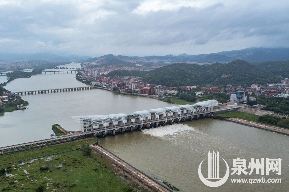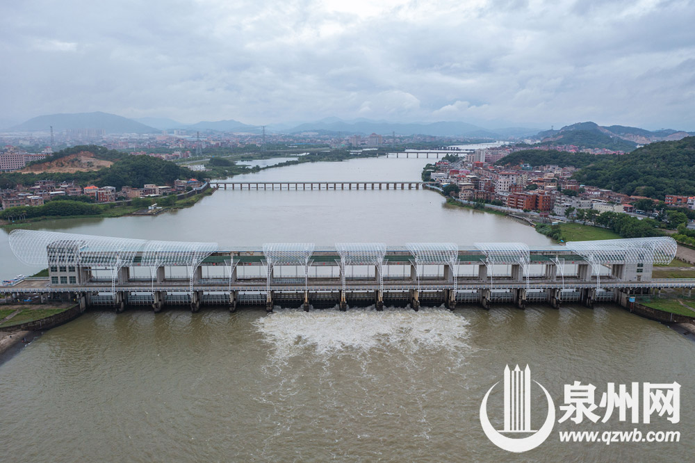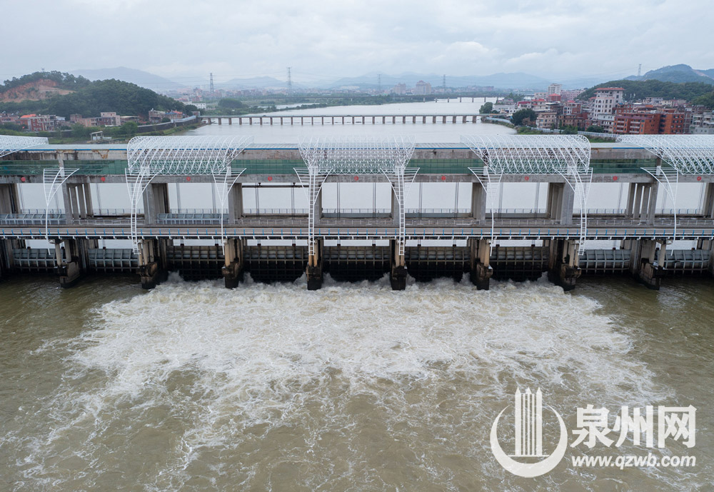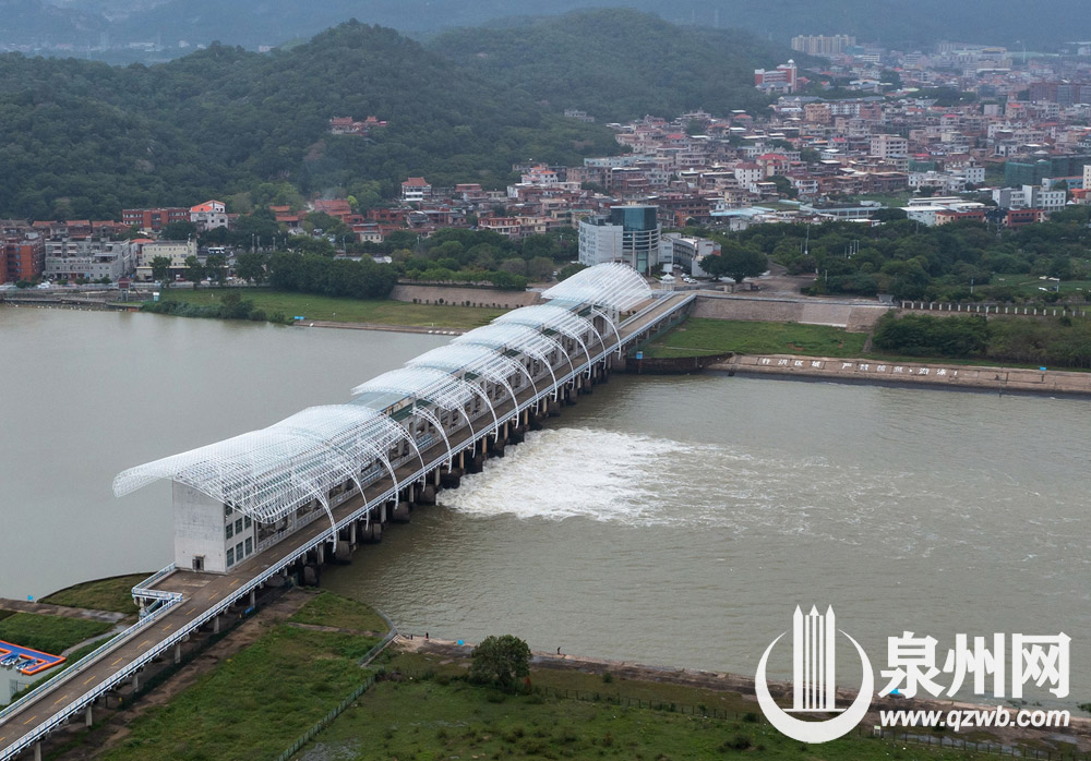 受西南急流和低层切变影响,连日来泉州市普降雨水,晋江水位猛涨,石砻水文测站12日最大流量达每秒545立方米。根据金鸡拦河闸防汛抗旱预案及控制运用计划,12日8时50分,金鸡拦河闸6#、7#、8#、9#、10#五孔闸门开启泄洪,最大下泄流量每秒508立方米,截至13日上午8时,累计泄水2272万立方米。图为5月13日拍摄的金鸡拦河闸开闸泄洪画面。 (陈起拓 林铭珊 许毅超 摄)