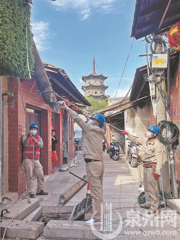 泉州网5月18日讯(记者 殷斯麒 文/图)“见证了历史,这几根电线杆从我小时候就在,拔除后望向东塔的视野没有遮挡了。”昨日,住在象峰巷的李阿婆站在家门口看着施工队拆掉电线杆后发出感慨。随着古城街巷提升工程推进,首批29条街巷综合提升进入立面修缮、管线下地阶段,第二批45条街巷综合提升也有序开始地面道路施工。