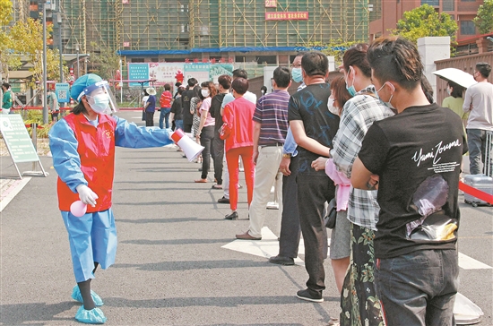 ▲志愿者手持小喇叭和酒精喷壶,顶着烈日维护核酸检测点检测秩序。(陈燕燕 摄)
