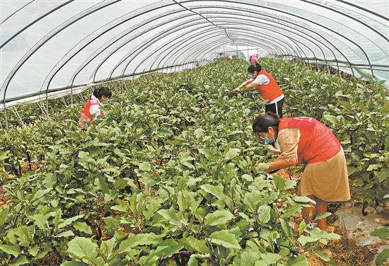 ▲疫情期间,为帮助种植户化解农副产品滞销难题,志愿者深入田间地头,帮助种植户抢抓时间采摘成熟的茄子。(黄海燕 摄)