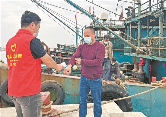▲志愿者为渔民测量体温 (陈丹怡 摄)