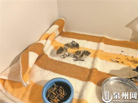 近日,记者在晋江市野生动物救助点见到了这3只小雏鸟,它们正在保温箱里的毛巾上“蹒跚学步”。由于幼鸟还未学会进食,现在只能由工作人员喂养。