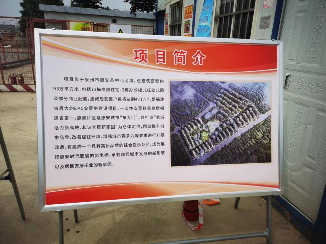 惠泉片区改造建设工程项目位于惠安县螺城镇黄金地段,挖掘机、渣土车等施工车辆正在现场来回穿梭,惠泉片区作为惠安城市“东大门”,围绕提升城市品质、改善居住环境、增强城市竞争力等要求进行升级改造建设,2020年纳入福建省公租户棚改项目清单,累计征收土地约510亩,征收房屋共3055户、房屋拆迁面积约57万平方米,并获批2021年度全省和谐征收示范项目荣誉称号。