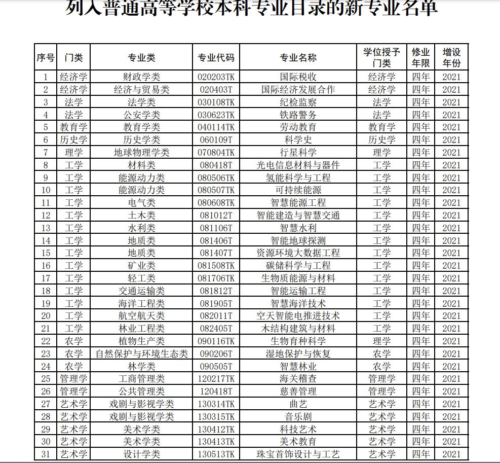 根据教育部2022年公布的2021年度普通高等学校本科专业备案和审批结果,新增备案专业1773个、审批专业188个,调整学位授予门类或修业年限专业点48个,撤销专业点804个。碳储科学与工程、空天智能电推进技术、生物育种科学、资源环境大数据工程、湿地保护与恢复、智慧林业、劳动教育、科学史等31种新专业正式纳入本科专业目录。
