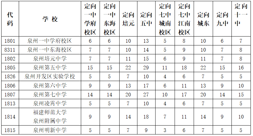 泉州五中、泉州一中、泉州培元中学、泉州七中、泉州城东中学和泉州九中、泉州十一中的定向生指标按总招生计划的50%比例分配到鲤城区、丰泽区、洛江区、泉州开发区的所有初中学校(含完全中学初中部)。