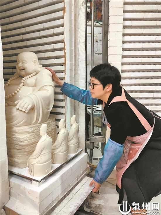 千年窑火,生生不息。德化陶瓷雕塑融合石刻、木雕、泥塑的技法特点,采用“捏、塑、雕、刻、刮、削、接、贴”八字技法,雕塑成型,然后放入窑中在一千多摄氏度的高温下烧制而成。年青一代陶瓷艺人在传承非遗技艺,也在不断挑战创新。近日,在泉州市工艺美术大师王韩英大师工作室内,王韩英正在专心致志地雕琢陶瓷人物立像作品,就连客人来访都没有注意到。待到完成一道修整工序后,她才回过神来,赶紧笑着说:“不好意思,这里比较乱,咱们上楼喝茶。”德化陶瓷人物立像创作在水分控制、烧制温度掌握等方面要求极高,成品率低。王韩英带领自己的团队开展陶瓷人物立像创作攻关,在这个类别上取得了显著的突破,进一步丰富了德化陶瓷艺术表现力。