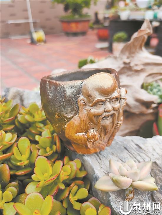 德化瓷烧制技艺可分为瓷土加工、雕塑成型、烧成三个过程。“对瓷土配方、陶瓷捏制、窑炉烧制,经过多年实践,我应该说是很熟练掌握了。如果再能熟谙柴烧陶瓷,就更能丰富自己的艺术表现形式。”说干就干,王韩英开始投入柴烧陶瓷中。常自嘲“手大”的她,捏起柴烧杯子来却不得不感谢自己的这个“缺点”:她手作的杯子器型大而厚,分量感十足,经过柴烧的淬炼,又增添了古拙的韵味,竟平添了商周时期铜鼎的历史厚重感。同时,她把自己擅长的瓷雕技艺运用到柴烧杯的创作中,为杯子外面增添了一些人物或花鸟虫鱼的形象,在方寸天地间精雕细琢,神韵俱佳。在一款“寿星杯”上,寿星雕像小而精,笑容可掬,柴烧赋予了其金光闪闪的色泽,搭配岩石般色彩和质感的杯体,显得厚重而灵动,把“长寿”的寓意表达得淋漓尽致。