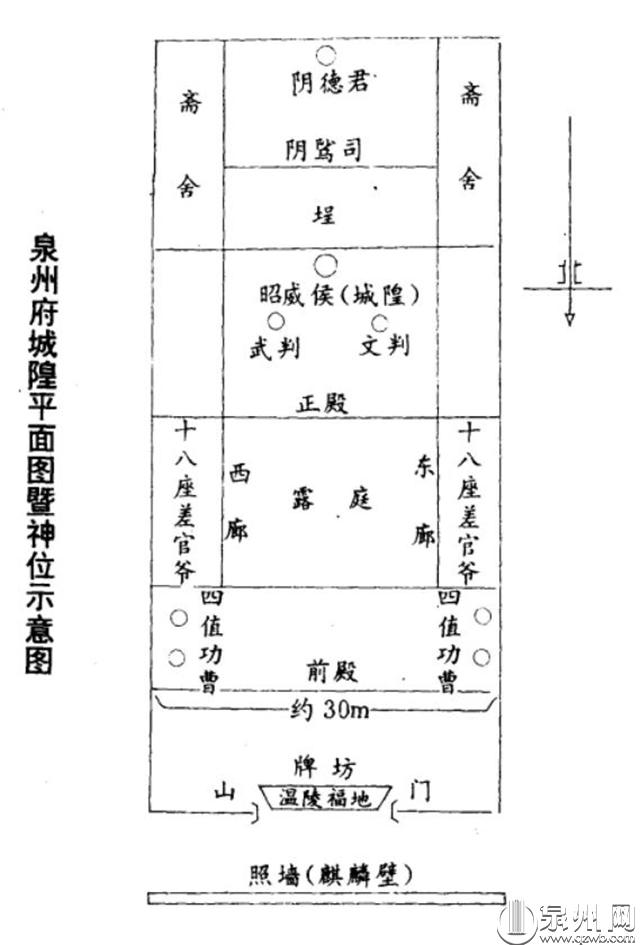 ▲以前府城隍庙的示意图,照墙是如今开元寺内的麒麟壁。