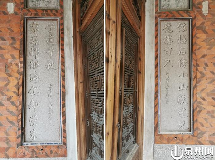 据陈仲瑾之孙陈笃恒介绍,祖父与曾遒为同年(1902年,清光绪二十八年)举人,与不少侨领有交往,但很少为别人题字,泉州市区范围内,此前只在西街汤家八角楼看到过他撰写的楹联。在两侧楹联下方,均可看到一个不易发现的圆形小孔,外小里大,当年常有匪患,出于安全考虑,可以从这里观察门外的不速之客。
