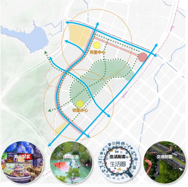 片区将通过四大策略,实现从“空间建造”到“场景营造”,构筑美好生活场景,打造多种高端配套组成的公园社区。