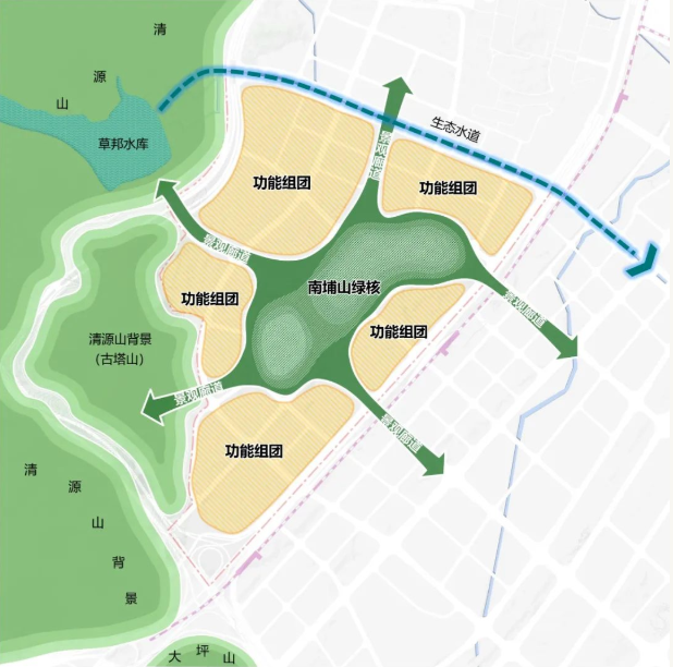 据了解,南埔山片区位于城东组团,总面积约2900亩,西枕清源山,东朝洛阳江,内拥南埔山,北侧一水渠始于草邦水库,流经通源街,通往洛阳江。按照规划,该片区将打造集生态居住、人文休闲于一体的高品质公园社区,规划形成“一核三带四区”的用地结构。其中,“一核”即南埔山生态绿核;“三带”即通源街山水景观带、海韵街山水景观带、北迎宾大道城市形象展示带;“四区”即东部商住片区、西部居住片区、北部产业片区、中部生态游憩公园。