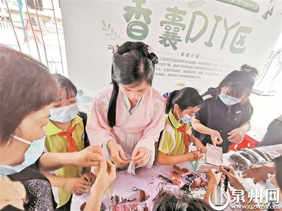 这边,艾草清香弥漫,一名小学老师身穿汉服,耐心地指导着村民们缝制香囊。仑苍第一小学5年级学生小王正在熟练地填艾草、装香料。不一会儿,一个个小巧精致的香囊便映入眼帘。“我上周刚在学校学过,我要把这个香囊送给妈妈。”小王边笑边嗅着香囊的香味说,香囊驱蚊防毒又漂亮,妈妈肯定很喜欢。