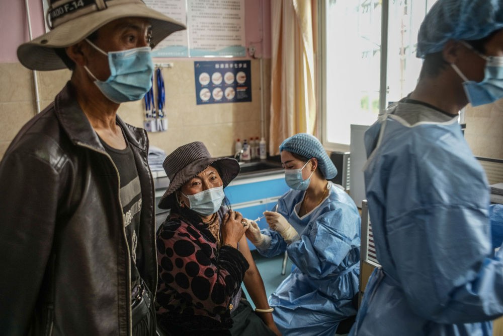 在四川甘孜州稻城县疫苗接种点,当地群众在接种新冠病毒疫苗。这批疫苗经过三天冷链运输,从北京送到2000多公里以外的稻城,保证当地群众接种(2021年7月24日摄)。