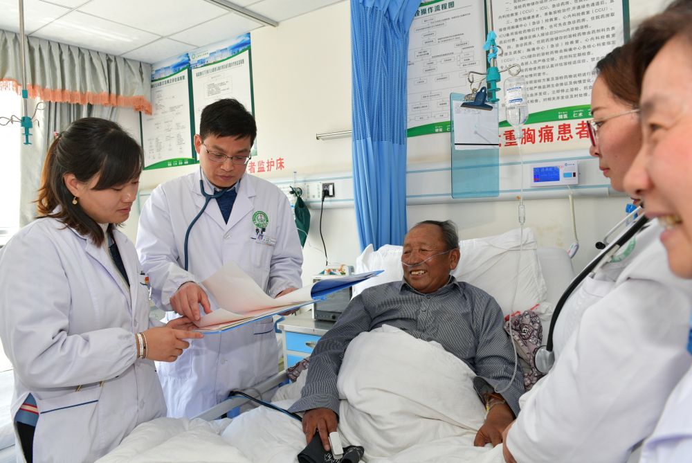 在西藏山南市人民医院,来自安徽的援藏医生梁有峰(左二)带领医生们查房。“组团式”医疗援藏提升了山南市医疗水平(2019年4月24日摄)。