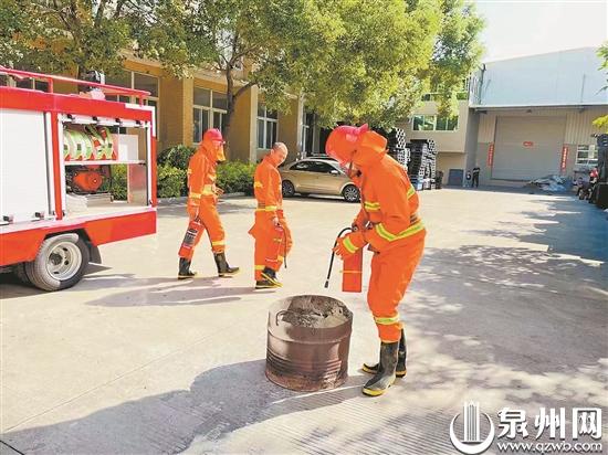 泉州积极开展安全生产标准化提升专项行动。图为一鸣交通电器公司定期组织员工开展消防演练。(受访公司供图)