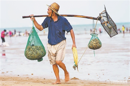 文蛤是一种埋栖型贝类,多分布在沿海内湾地势比较平坦的潮间带上,它通常将整个身体埋在海边的泥沙之中,捕食海潮带来的浮游生物。夏季潮汐来临,正是采收文蛤的最佳时机。“落潮之后,海滩上会出现一个个的小孔,这是文蛤的呼吸气孔。采蛤的渔民在有气孔的海滩上用脚不停地踩,文蛤便渐渐地从沙滩下浮上来。这时候,再用文蛤耙把它们耙起来。”