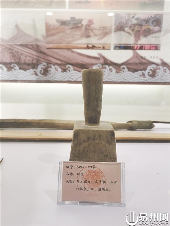 “蟳埔海蛎肥美可口,村民会根据潮涨潮落的规律,去滩涂上撬海蛎,蚵槌、蚵打就是必须用到的工具。”黄老先生指着一个用木头制作的槌子说道。槌子的手柄比较短小,头比较大,“与旁边用铁制作、形似锥子的蚵打配合,才能很顺利地把海蛎敲下来”。