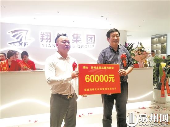 泉州网6月10日讯 (记者陈祥木 林福龙 通讯员陈靖涵 文/图)6月6日上午,爱心企业福建翔锋化妆品集团有限公司向泉州市见义勇为协会捐赠善款6万元。