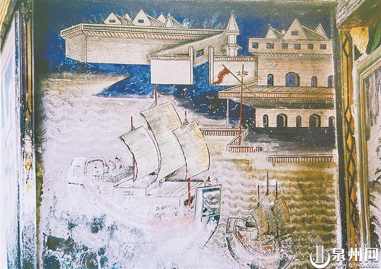 永泰县东坡村永庚厝阿拉伯风格建筑与中式帆船壁画,画中帆船船头有狮头形象。