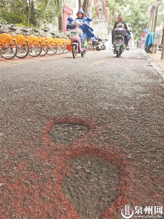 “对面脱粒的情况更严重,好几个月前就那样了。”一位市民看到记者在拍照,表示在泉州正骨医院门前的数十米路面破损很严重。记者骑共享电单车从悦华酒店往宝洲街路口驶去,一路颠簸不停,先是看到阳光曼哈顿小区门前有多个小坑,接着看到正骨医院门前彩色沥青路面存在明显脱粒现象。