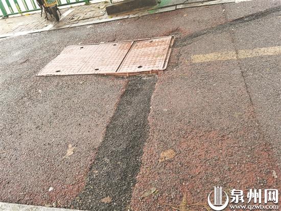 在东美加油站前,除了一处明显下陷的路面,旁边一整块用水泥填补的路面也很显眼。在泉州电信广场前一个窨井盖处,一条用黑色沥青填补的伤疤带存在严重的脱粒现象。对此,不少市民反映,这是道路被乱破开后又随意填补造成。
