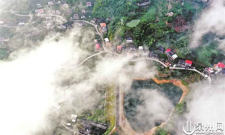 连日持续降雨,南安市蓬华镇山城村云雾缭绕,村庄和道路在云雾中若隐若现,好似一幅水墨画卷。(张九强 摄)
