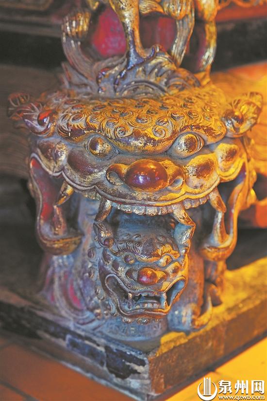 大殿供桌的四只脚有狮子雕刻,大狮子下方套着一只小狮子。