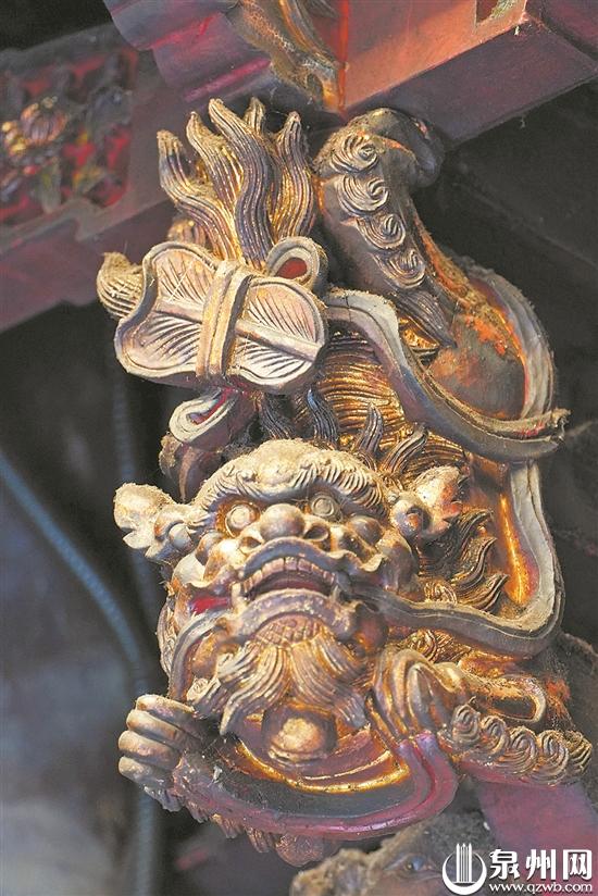 祖师殿内更是雕梁画栋。房梁上的木雕狮子有的举芭蕉扇,有的顶着葫芦,有的和飞天共舞,有的把玩着金球,有的顶着文牍。更让记者感到百思不得其解的是,祖殿中门上方房梁上,雕刻着狮子、赤虎、凤凰等三种神兽、神鸟,狮子位于正中间的“C位”,狮子的两侧往外分列赤虎和凤凰,狮子处在正中,这种情况相当少见。记者询问清水岩管理处人员和方丈等人,他们说,这是雕刻者为之,至于为什么狮子处于“C位”他们也不得而知。