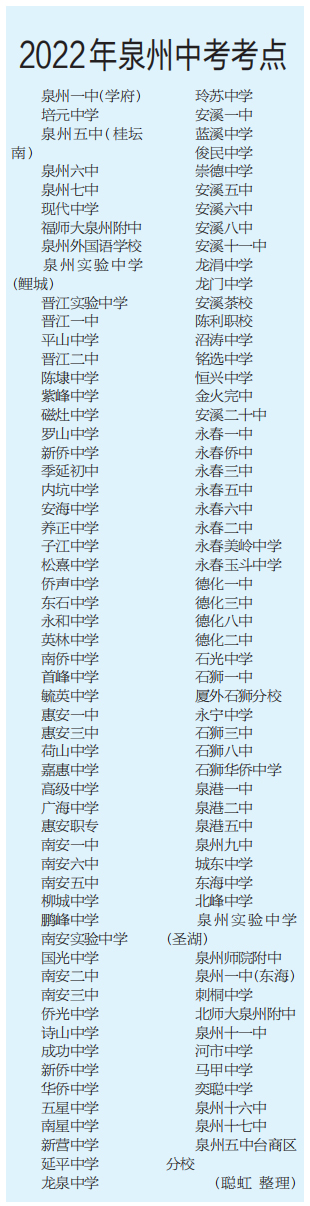 今年泉州仍实行初中毕业与高中阶段学校招生考试“两考合一”。语文、数学、英语、道德与法治、历史、地理、物理、化学、生物等9个科目及体育与健康基本知识考试实行省级统一考试,全部实行书面闭卷笔试形式。