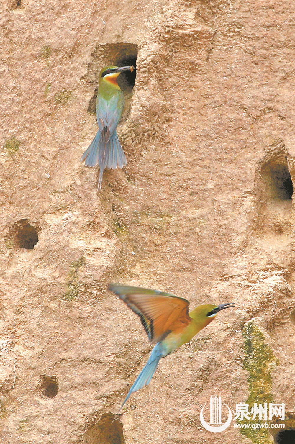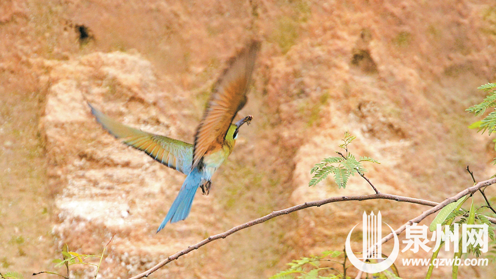 体形较小的雄鸟十分忙碌,从四面八方“打猎”归来,鸟喙衔着蝴蝶、蜻蜓、蜜蜂等猎物,在半空中盘旋一阵后,钻入垂直于土崖的巢穴中,喂养“守家”的雌鸟或刚出壳的幼鸟,然后继续出巢觅食,如此反复。
