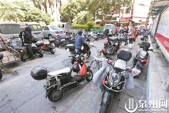 个别商贩为了多摆放货品,占据了一部分通道。市场东门、西门均划有停车位。从西门进出的市民不少,因电动车停车位有限,不少车辆停放在线外。
