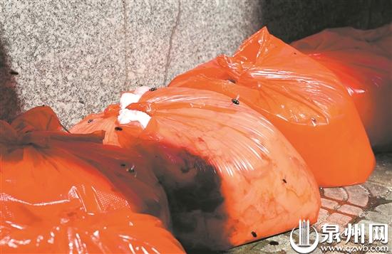 市场北门、西门,有个别商贩在门口位置、非机动车停车位占据“有利位置”,随意摆设摊点。在西门前的花圃旁,几袋红色的塑料袋装着货品,一字排开堆在地上。这些货品为动物下水,腥臭不已,引来无数苍蝇。旁边的商家说,这是市场里的肉贩放的,应该是有人订购了要运走,临时放在这边的。