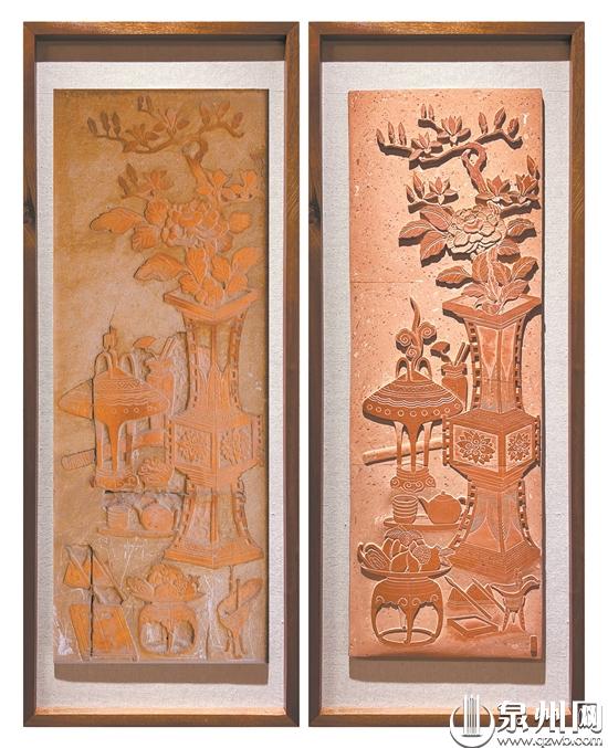清代红砖古建筑上的砖雕(左图)被伍建东“复刻”成新的作品(右图)