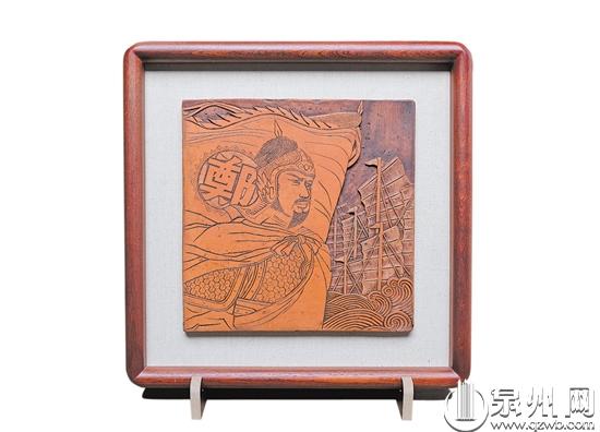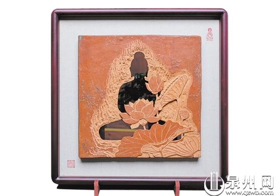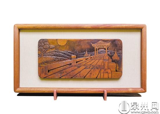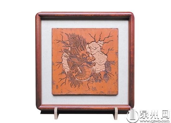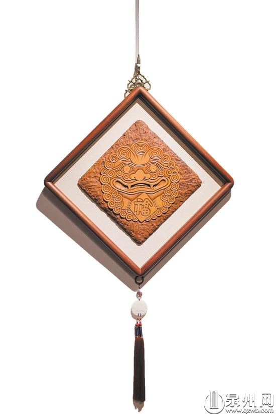 他雕刻的一幅有着闽南燕尾脊和明月元素的挂件作品被一位华侨带走。作品将百年古砖与传统工艺相结合,采用线雕、浅浮雕、平地沉雕等传统雕刻法,融合燕尾脊与圆月等元素,极具闽南味道。