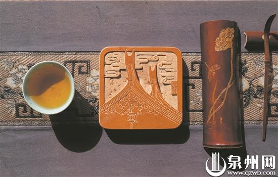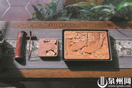 闽南人爱茶,伍建东就创作出一系列砖雕茶饰,包括茶盘、杯托、壶承等。除此,他还将闽南红砖设计成壶承、香插、镇纸、摆件等物品。