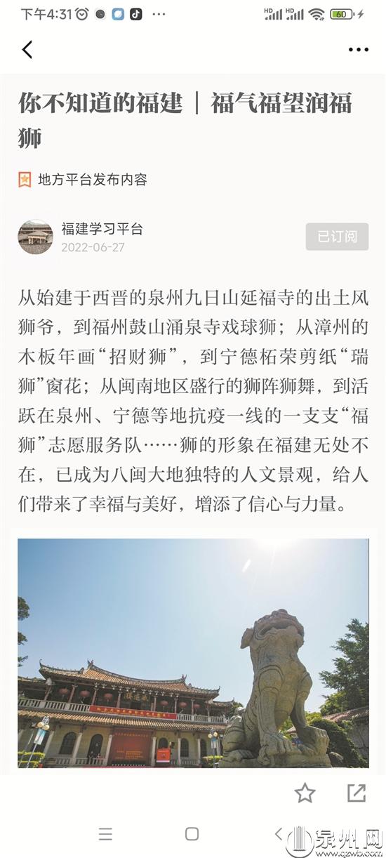 从始建于西晋的泉州九日山延福寺的出土风狮爷,到福州鼓山涌泉寺戏球狮;从漳州的木板年画“招财狮”,到宁德柘荣剪纸“瑞狮”窗花;从闽南地区盛行的狮阵狮舞,到活跃在泉州、宁德等地抗疫一线的一支支“福狮”志愿服务队……狮的形象在福建无处不在,已成为八闽大地独特的人文景观,给人们带来了幸福与美好,增添了信心与力量。