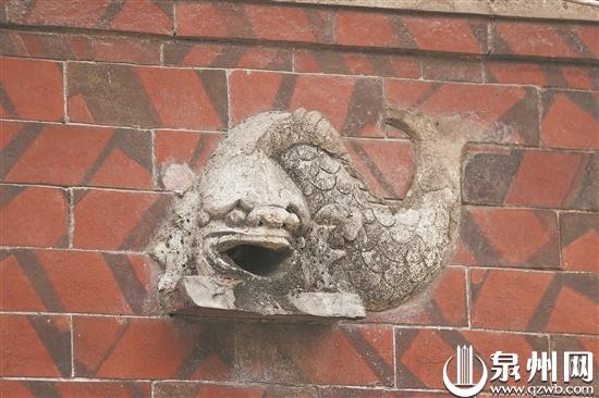 闽南红砖墙上的狮头鱼身石灰塑像(陈英杰 摄)