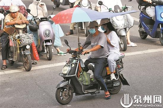在温陵路,记者观察了一会发现,有三四部装有遮阳伞的电动车驶过,有的车辆载人,有的是外卖小哥……据悉,加装遮阳伞的电动车碰到强风时,会出现车辆不稳的情况。在走访中,记者发现电动车加装的遮阳伞造型五花八门:有的遮阳伞用一根铁管固定在车把上,尾部加长;有的遮阳伞前后都有固定装置,如同给电动车加了一个帐篷;有的是伞架纵向贯穿车身前后,伞篷可向两侧收放。